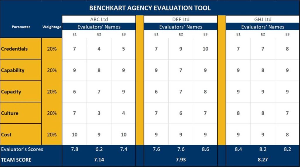 We have recommended equal weightage for each of the 5 parameters (20%). You can change it in the excel tool if you feel a different weightage is needed. Similarly, we have recommended that each panel member have an equal weightage in the decision-making process. You can change it if there is a significant expertise difference or if the same people are not available across all the agency meetings (though highly recommended). These changes (or addition of panel members) are fairly simple to be done in the excel tool provided at the end of the article. You can reach out to us at outsource@benchkart.com if you need any assistance with the tool.